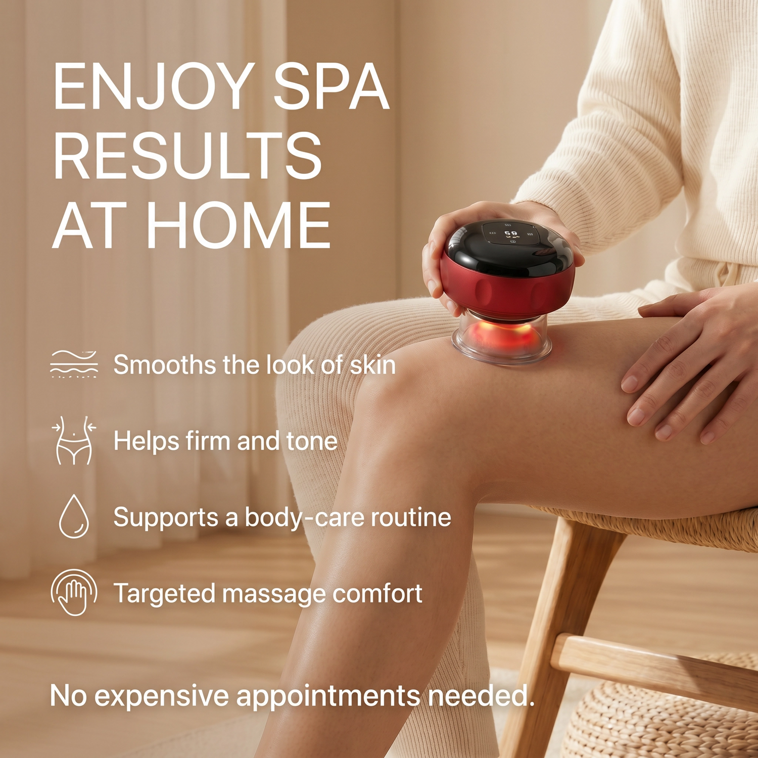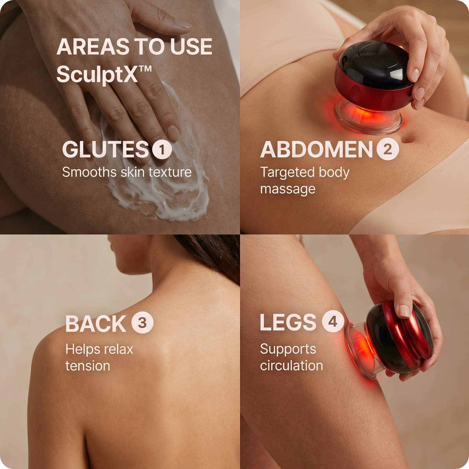 SculptX™ is designed for versatile, full-body use, helping smooth the appearance of skin and support more sculpted-looking results in key areas like the waist, legs, arms, glutes and back... all from the comfort of home.